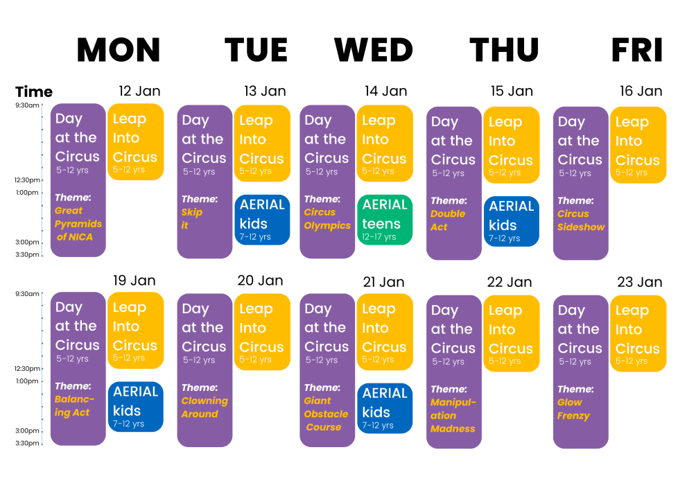 Leap Into Circus kicks off every morning and is action-packed with circus! Fly through the air, tumble across mats, balance in style and learn cool tricks. In the afternoons, the adventure continues with a Day at the Circus, where each day features a fun-filled circus theme, check out our timetable below to see what surprises are in store for kids aged 5-12.